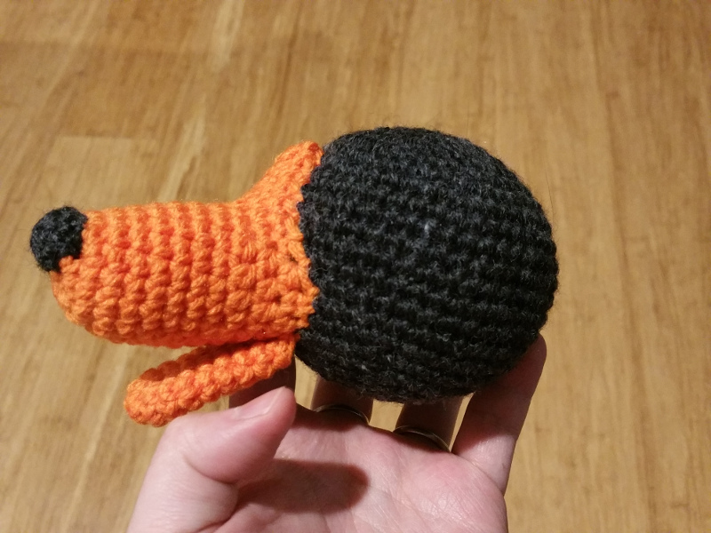 In the next round,, you may want to use thread to leave a mark 10 stitches in so you can see where the orange stomach patch should go.